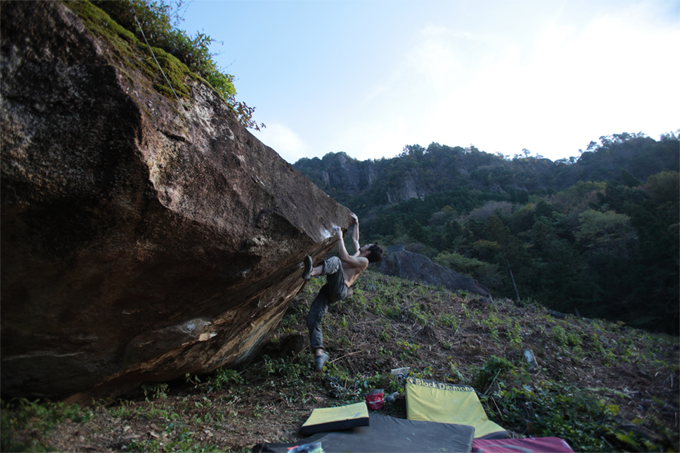 移動してここのエリアを代表する課題「カンダカラ」3段-V10 に二人はトライ。